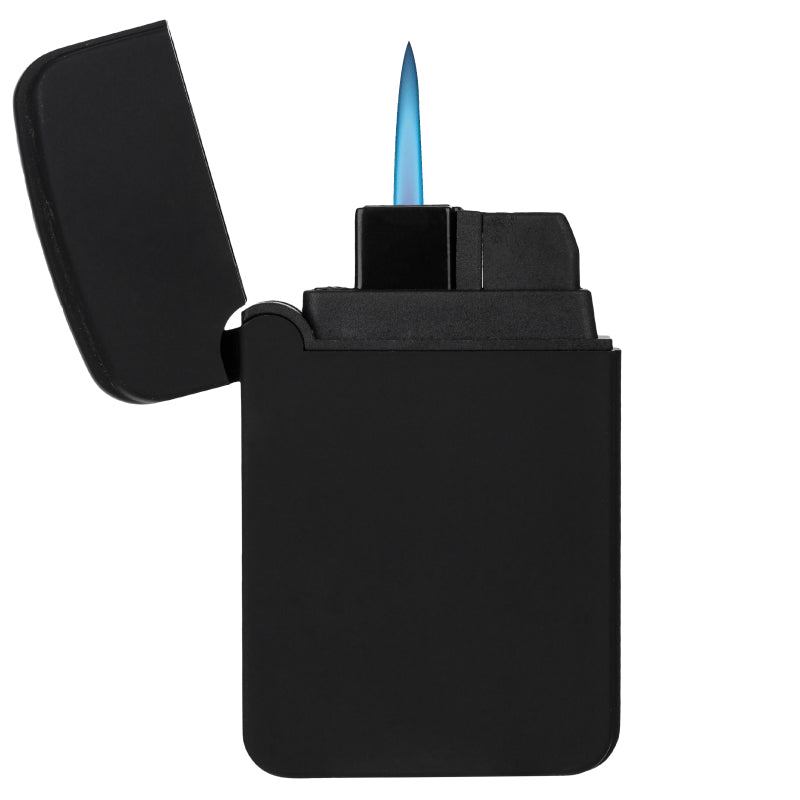 Adding 1 to your order = 100 pieces ($7.14ea) A perfect and inexpensive way to light up your cigar. Matte black rubberized jet torch flameless lighter. Large and flat decoration area for maximum logo presence. Blue jet turbo flame. CPSC Approved. HazMat Shipping - $40 per case via FedEx Ground.